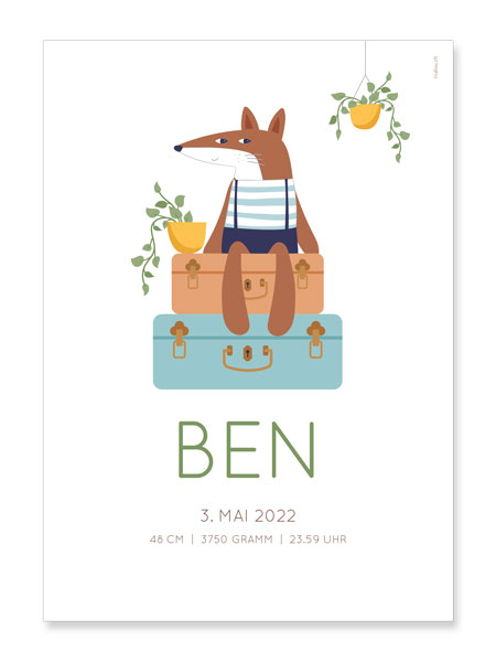 Die Koffer sind gepackt. Süsses Geburtsposter mit niedlichem Fuchs. Es passt durch seine Schlichtheit perfekt in ein Kinder-/Babyzimmer im Boho-Stil. Name, Geburtsdatum, Gewicht, Grösse, Ort und